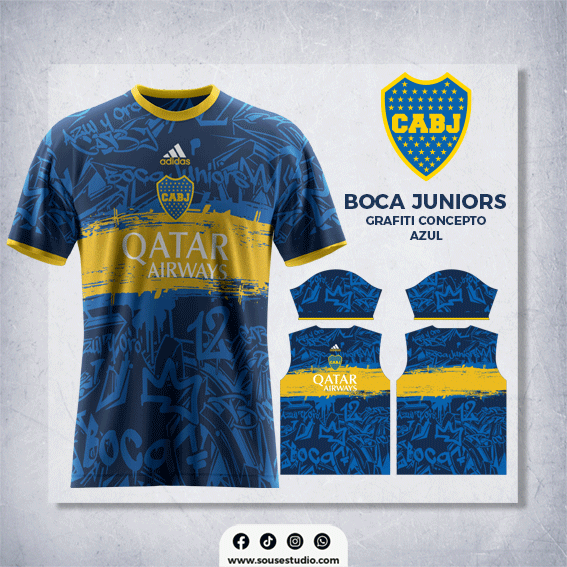 Diseño vectorial de la camiseta Boca Juniors Grafiti Concepto Azul. Este archivo en formato Adobe Illustrator (AI) está completamente vectorizado y es 100% editable, perfecto para tus proyectos de diseño de camisetas.