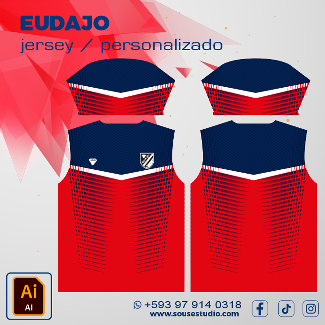 Este archivo en formato AI (Adobe Illustrator) no solo es ideal para diseñadores gráficos, sino también para tiendas de personalización textil, imprentas y emprendedores que desean ofrecer productos deportivos de calidad. El vector  Jersey Eudajo  es una base perfecta para diseñar camisetas de fútbol profesionales, con un acabado moderno y totalmente adaptable.